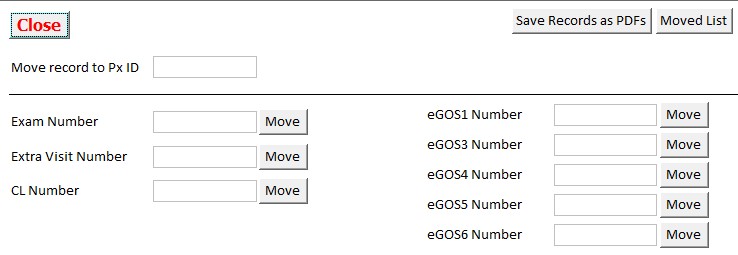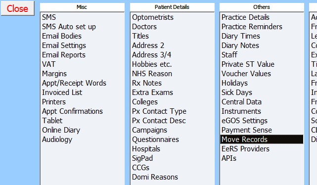 If you need to merge 2 records then you can use the Move Records screen in Lists to move exams/extra visits/CL screens and eGOS (England) from one patient to another. You have to move dispenses manually.